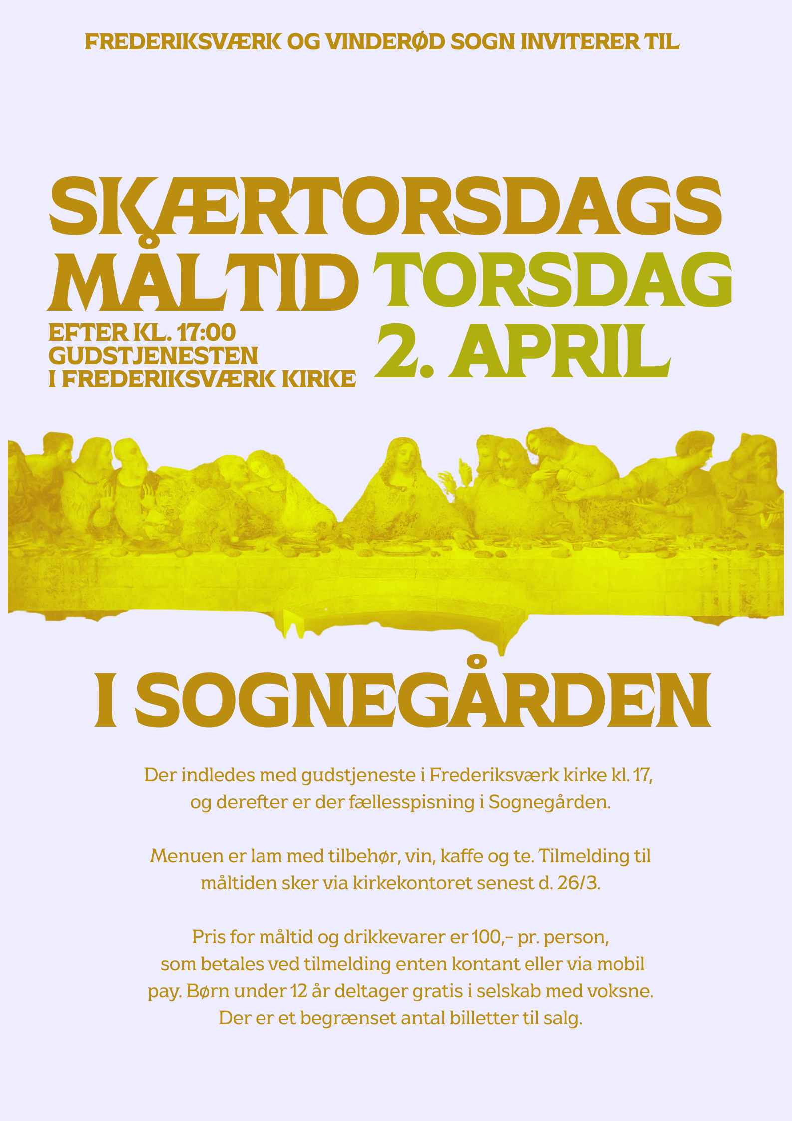 Menuen er lam med tilbehør, vin, kaffe og te. Tilmelding til måltidet sker via Kirkekontoret senest d. 26/3.